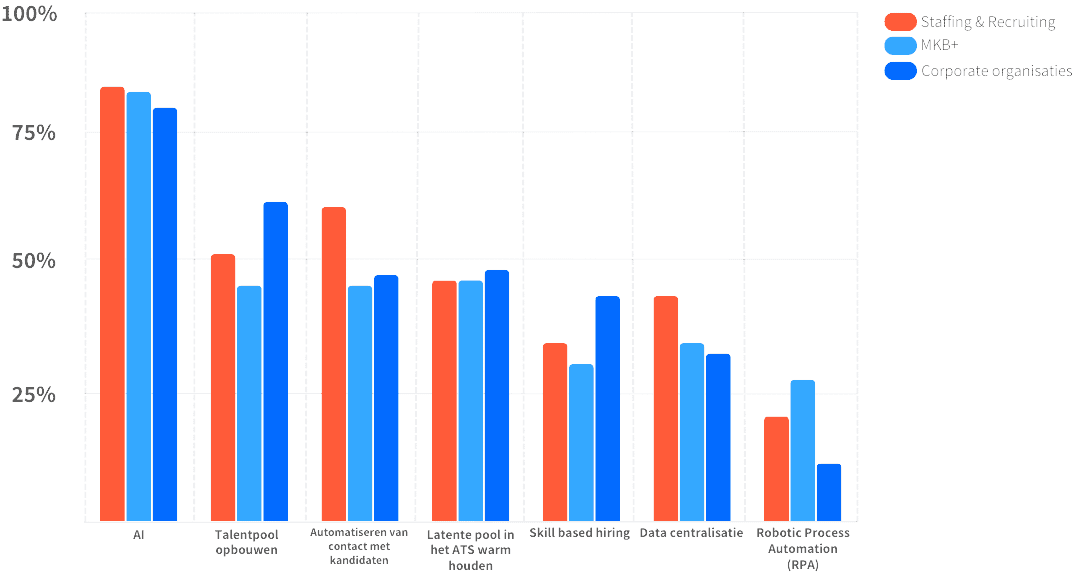 Als we de resultaten uit het onderzoek segmenteren op organisatietype (corporates, MKB en recruitment bureaus & staffing), dan zien we dat AI over alle segmenten met stip op 1 staat. In de rest van de top zien we kleine verschillen tussen de segmenten. Corporates zijn meer geïnteresseerd in het opbouwen van talentpools, terwijl recruitment bureaus en staffers vooral kijken naar mogelijkheden om het contact met kandidaten te automatiseren. Binnen het MKB liggen de nummers 2 tot en met 4 in de top 5 heel dicht bij elkaar.