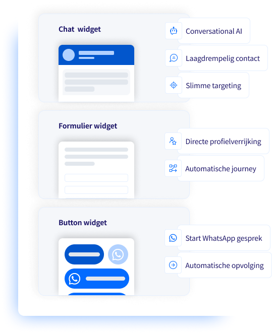 Chat-pop-ups, formulieren, WhatsApp-buttons, allemaal in je eigen huisstijl. Toon per pagina de juiste feature, start automatisch de juiste journey en verrijk profielen direct. Conversational AI of snelle WhatsApp/e-mail/SMS-flows nemen opvolging over.